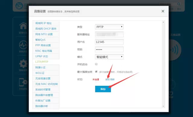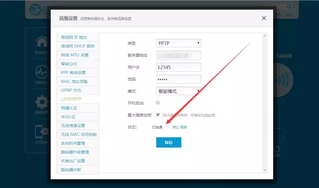 第三步,类型选择PPTP,服务器地址联系购买网站查看,帐号和密码也在购买网站查看,模式选择智能模式,选择智能模式是为了上你想上的网站时不干扰,开机启动看个人选择,我这里选择不开机启动,最大强度加密打勾,然后点保存,在点启动。