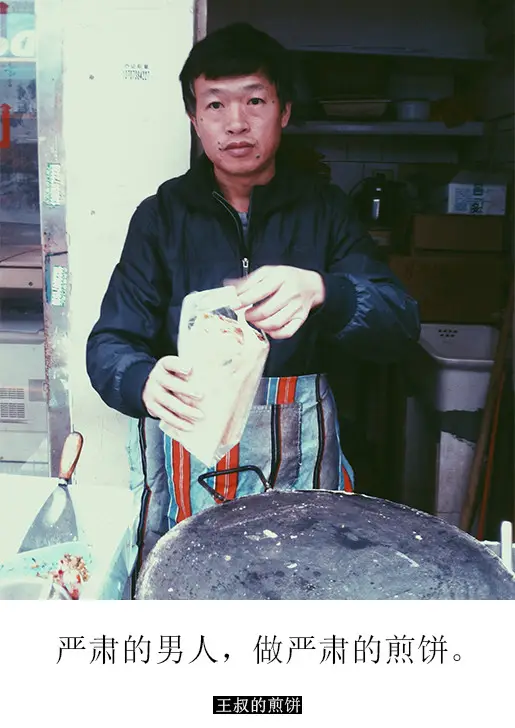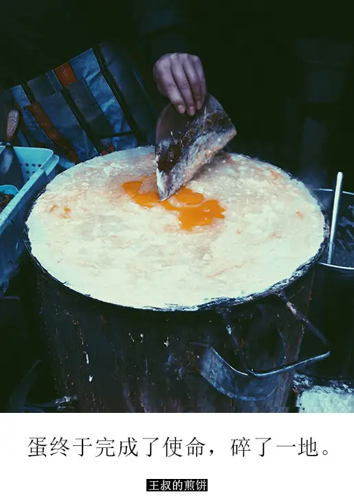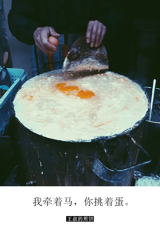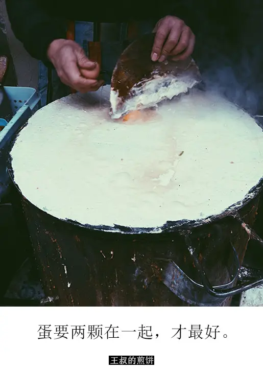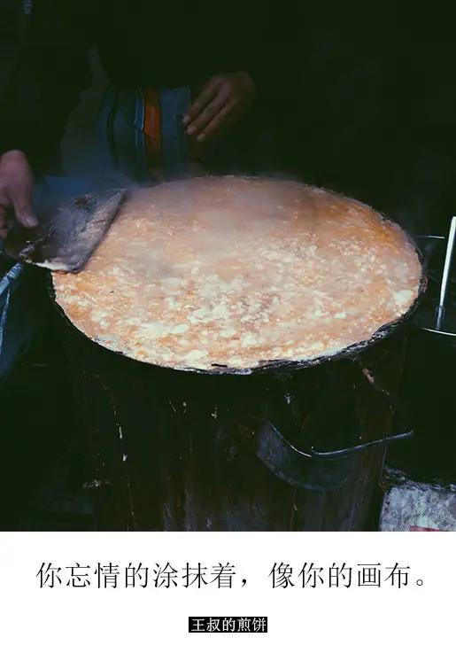 经常去楼下王叔儿那买煎饼果子吃,一来二去就吃上了瘾。在台下看王叔那一招一式,颇有点武林遗风的逼格。小铲子刮来刮去让时间仿佛静止了一般,流程一板一眼拿捏的恰当好处。看那一勺面瞬间由点匀成面也不过两秒钟的光景,且厚薄得当。鸡蛋落下与煎饼慢慢交融韧中带香,香菜与咸菜腾空洒落提鲜增味,一勺辣椒让你足以与这肆虐寒冬轻松对抗,薄脆在温度的融化下脆软共存,甜面酱香甜够味又让彼此你中有我我中有你。热乎乎的出炉,一口咬下去,咬出一大口满足。
