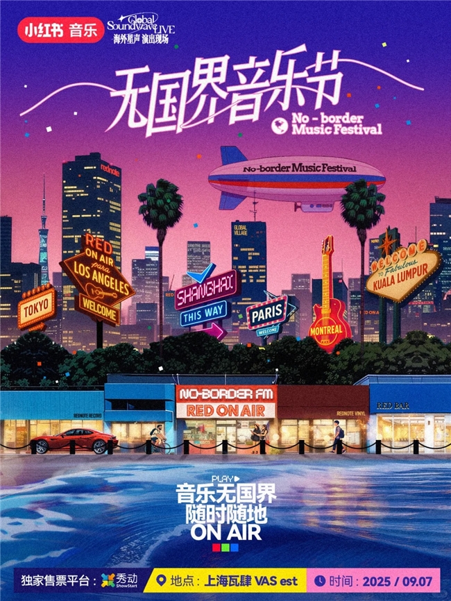 “无国界音乐节” 海报以梦幻的城市夜景为背景,东京、洛杉矶、上海、巴黎等城市的标识牌错落分布,搭配飞艇等元素,构建出跨越国界的音乐想象空间。“音乐无国界,随时随地 ON AIR” 的文案,传递出打破边界、共享音乐的理念,契合小红书作为内容平台,连接多元文化、汇聚全球音乐爱好者的特质,为年轻人打造出一场无界的音乐盛宴。