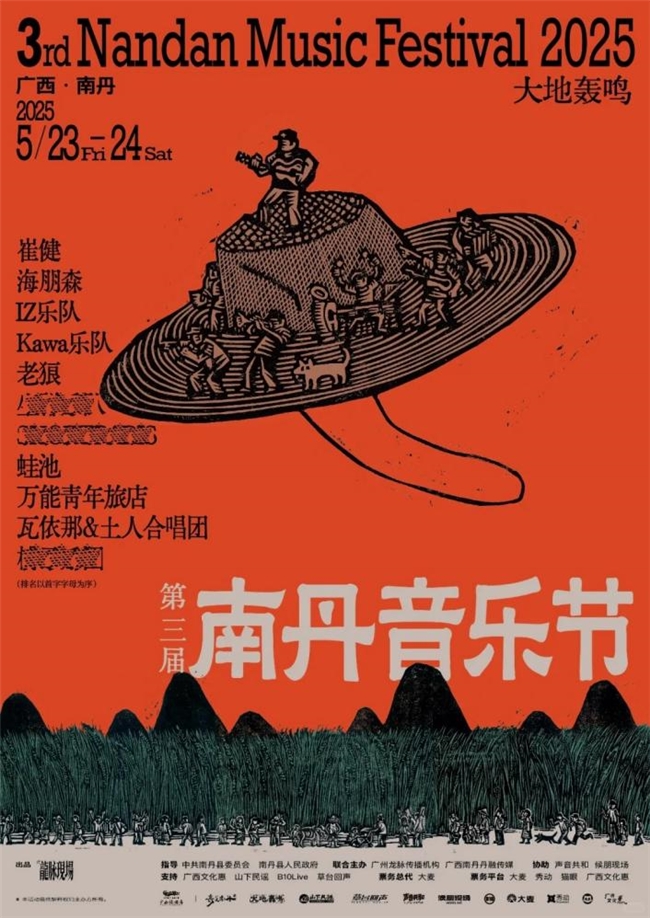 第三届南丹音乐节海报采用鲜明的橙红色调,以独特的版画风格呈现,画面中巨大的斗笠承载着音乐人,下方是绵延的山峦与人群,充满在地文化特色。“大地轰鸣” 的主题,结合崔健、万能青年旅店等知名乐队阵容,将本土文化与摇滚、民谣等音乐风格融合,展现出音乐节对在地文化与青年音乐文化的双重探索,吸引着追求文化深度与音乐激情的群体。