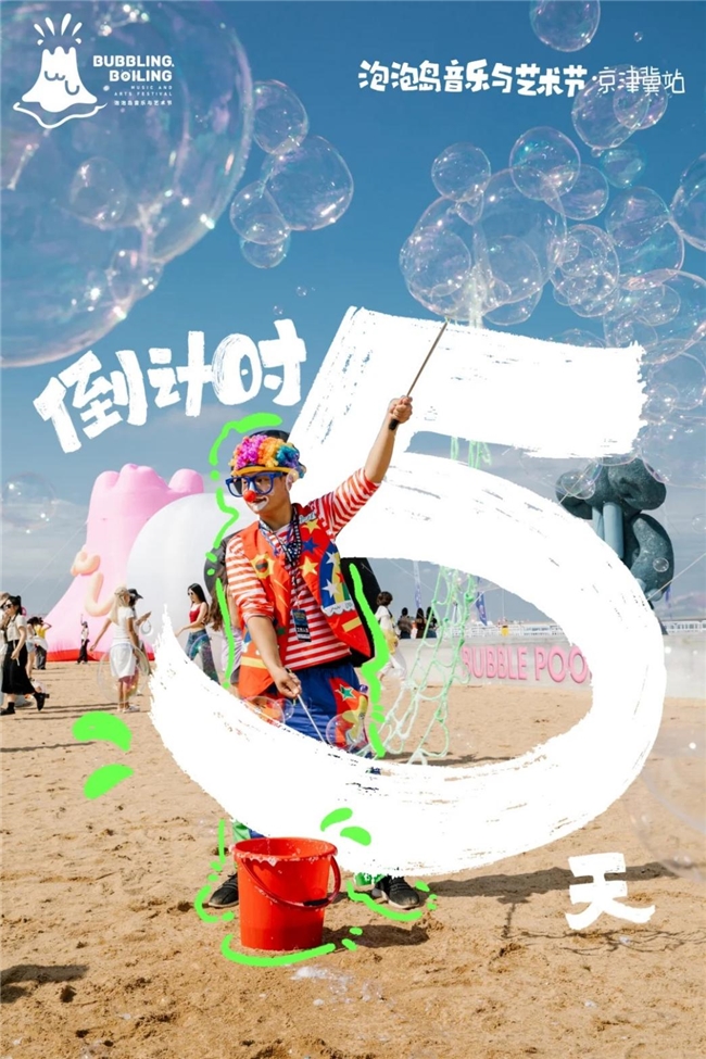 京津冀站的倒计时海报,以沙滩为场景,小丑表演、巨大泡泡等元素充满童趣与欢乐,“倒计时 5 天” 的文字醒目突出。海报通过鲜活的现场感与充满趣味的视觉符号,传递出音乐节的欢乐、创意氛围,勾起年轻人对这场艺术与音乐交融盛会的期待,展现出品牌打造沉浸式、趣味性活动的用心。