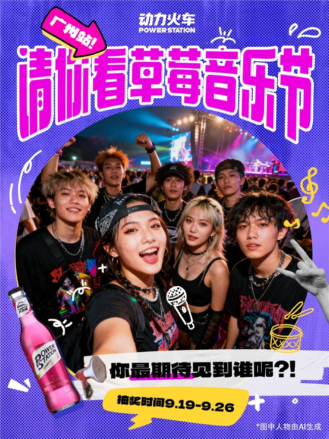 “请你看草莓音乐节(广州站)” 海报,以炫酷的紫色为基调,融入音乐节现场的热烈画面与品牌产品,“你最期待见到谁呢?!” 的文案充满互动性,抽奖活动也增强了吸引力。动力火车借助草莓音乐节这一知名 IP,将品牌与年轻群体喜爱的潮流音乐场景深度绑定,传递出品牌年轻、活力、乐于参与青年文化的特质。