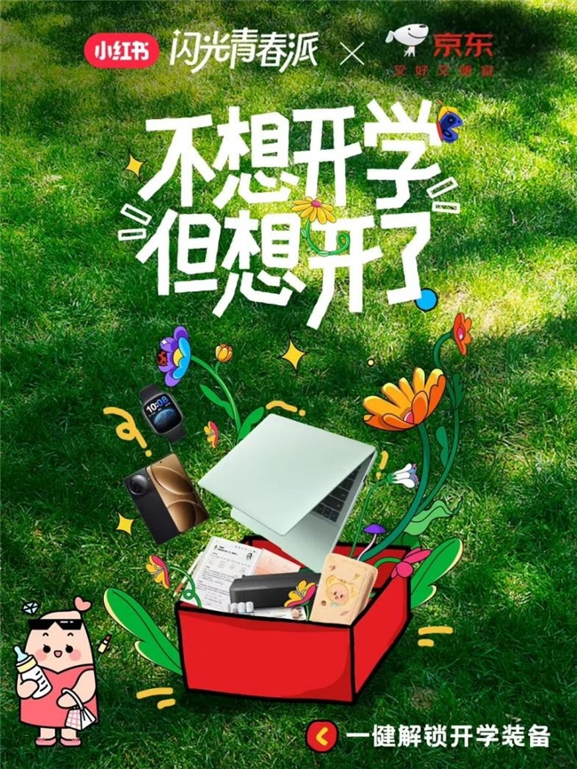 以 “不想开学,但想开了” 为主题,绿色草地背景充满生机,红色礼盒中装满各类开学装备,搭配可爱的插画元素,既道出了学生对开学的复杂情绪,又巧妙地将京东的开学好物与开学期待结合,满足学生开学采购的需求,传递出用好物开启新学年的美好期许。