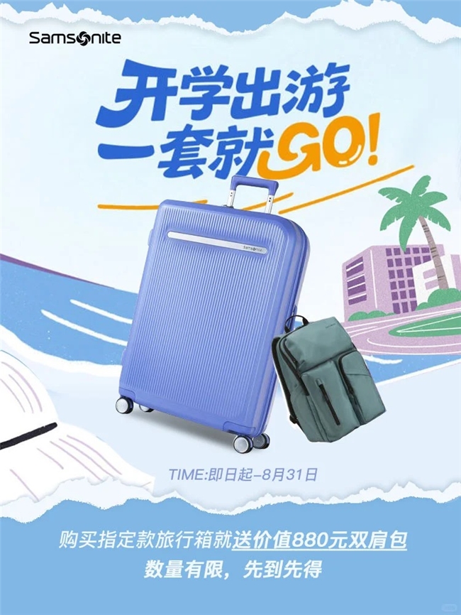 海报以 “开学出游一套就 GO” 为核心,画面展示了实用的行李箱与背包,背景的校园、沙滩等元素,融合了开学与出游的场景,突出产品 “一套满足开学出行多场景” 的优势,精准把握学生开学季出行、购置装备的需求,为学生提供便捷的出行解决方案。