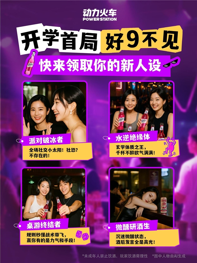 海报以 “开学首局 好 9 不见,快来领取你的新人设” 为主题,紫色的夜场氛围背景,搭配不同 “新人设” 的年轻群体形象,如 “派对破冰者”“微醺研酒生” 等,将产品与校园社交、派对场景结合,契合学生开学后渴望社交、展现自我的心态,为品牌赋予青春、潮流的属性。