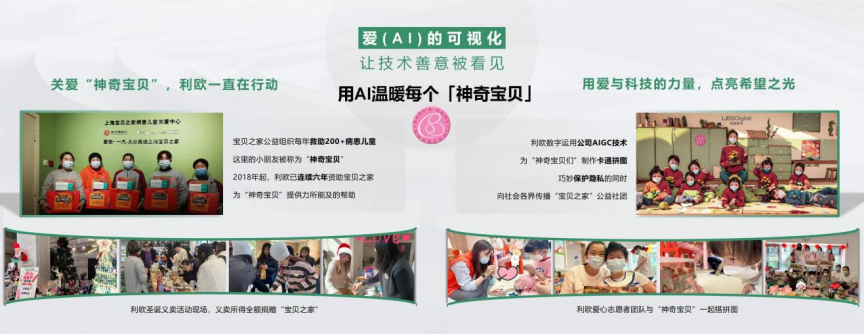 在上海宝贝之家困境儿童关爱中心,有一群可爱的“神奇宝贝”。由于肖像保护的限制,如何向社会展示他们的状况、传递他们的需求,曾是一个难题。利欧数字的志愿者们自2018年起,便与这里结下了不解之缘。他们连续七年提供资助,每年圣诞的爱心义卖、5月20日的定期陪伴,都已成为利欧人与宝贝们心中温暖的约定。如今,利欧数字带来了新的“礼物”。他们巧妙运用AIGC技术,为孩子们制作独一 无二的AI拼图和创意徽章。这些充满童趣的艺术作品,既严格保护了孩子们的隐私,又将他们的纯真与可爱以另一种形式展现给社会,让“宝贝之家”的故事得以更广泛地传播。这正是“AI可视化”的力量——让善意被看见,让无法讲述的故事被感知。利欧数字用技术搭建起一座桥梁,让“宝贝之家”的故事走得更远,吸引更多温暖的关注与回响。