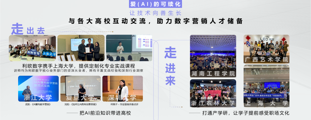 而对于即将踏入社会的青年学子,利欧数字同样倾注善意,利欧数字主动架起了连接高校与行业的桥梁。在复旦大学的课堂里,广告系的同学们可以使用由利欧数字公益化提供的LEO AIGC技术工具进行创作。在上海大学,利欧数字的公益合作已步入第三个年头,来自核心业务部门的资深从业者们走上讲台,将鲜活的实战案例、宝贵的行业洞察化为一堂堂定制化专业课程。这些课程绝非纸上谈兵,而是真刀真枪的经验传授,赢得了师生们的一致好评。这种“AI可续化”的实践,正是利欧数字将企业技术能力和实战经验反哺教育的生动体现,为青年才俊的成长提供了最前沿的“燃料”。