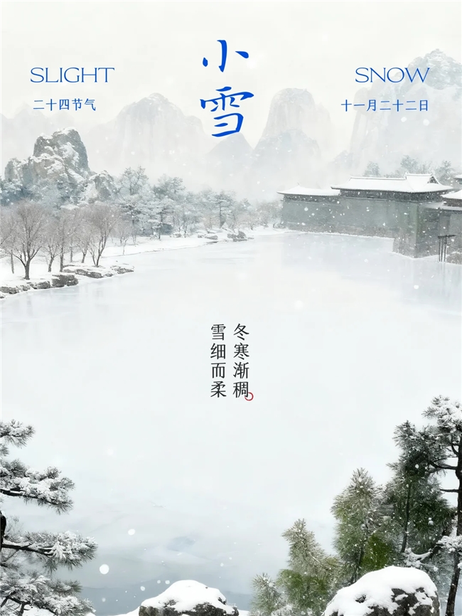 以水墨质感的雪景园林为载体,用 “冬寒渐稠 雪细而柔” 的文案点出节气特质,东方山水意境与冬日诗意完美融合。