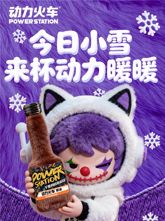 把毛绒质感包装的产品与潮玩形象绑定,用 “今日小雪 来杯动力暖暖” 的口语化 slogan,让小雪的寒意和产品的暖感形成软关联,年轻潮酷的调性和节气场景适配度拉满。