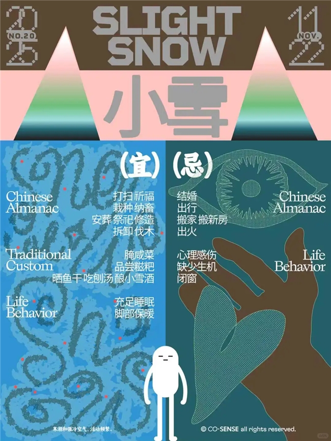 将小雪民俗的宜 / 忌拆解为现代视觉模块,撞色 + 几何感设计让传统节气知识变得潮酷又直观好读。