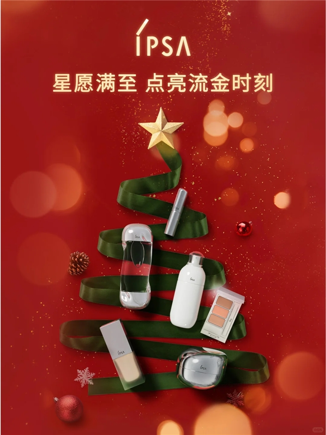 拿丝带卷出圣诞树形态,把彩妆护肤单品嵌进节日装饰里,红金质感既衬圣诞氛围,又没丢美妆品牌的高级感。