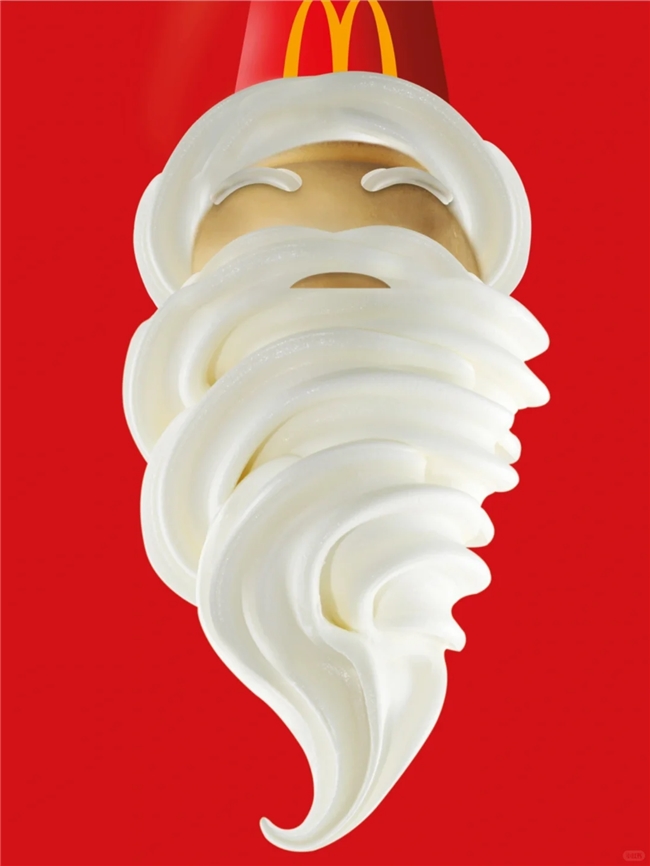 把经典甜筒扭成圣诞老人的白胡子,用产品本身玩圣诞梗,红底 + 品牌色的视觉既醒目,又裹满了节日萌感。