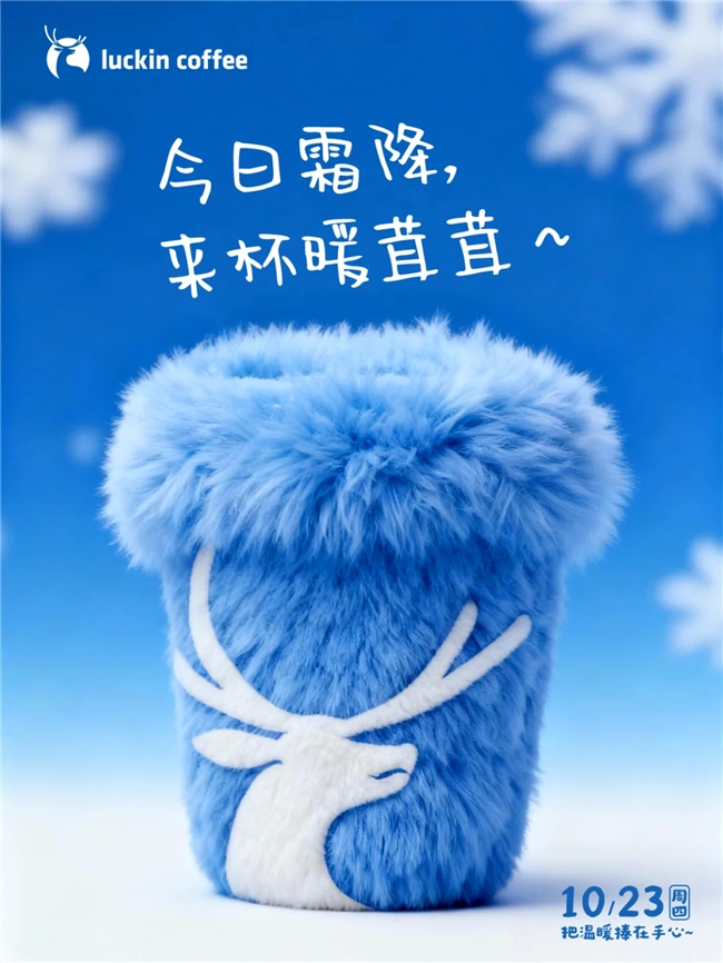 借霜降节气推出毛茸茸杯套,软乎乎的材质和 “暖茸茸” 文案形成呼应,把秋冬饮品的温暖属性通过视觉质感精准传递。