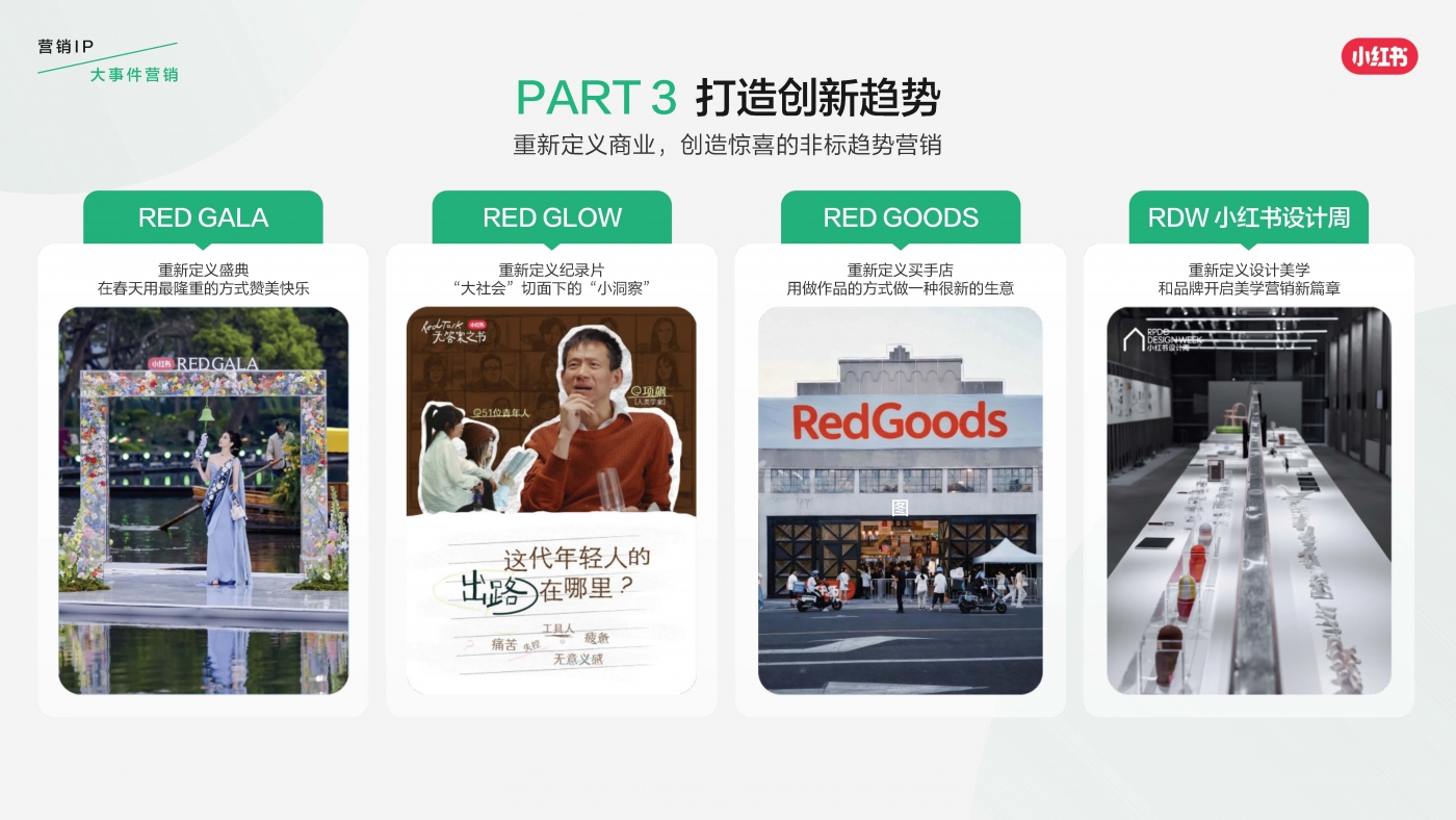 RED GLOW和RED GOODS是新IP。从策划来看,RED GLOW社科人文内容导向突出,似乎是为了赶上视频播客的风口;RED GOODS则可以视为小红书把线上的生活方式电商,以特色买手店为载体搬到线下的一种探索。