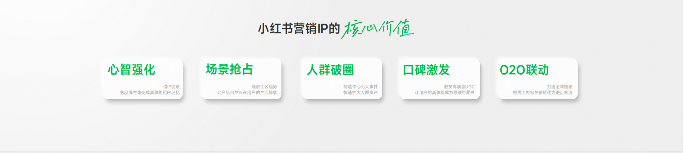 又思(小红书商业市场营销中台总经理)曾将小红书营销IP的价值归为5点,并提出它们“几乎涵盖了所有行业不同发展阶段都会遇到的一些核心问题”:
