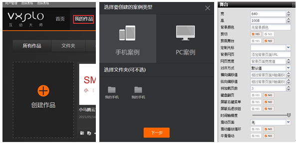 2.在我的作品里,创建一个新的手机案例,根据需要调整舞台大小(大多数手机像素是640*1008,iPhone4的是640*832,iPhone5/5S的是640*1008,iPhone6的是640*1030,iPhone6+的是640*1040),互动大师默认的舞台大小是640*1008,该案例是以大多数手机尺寸为准,就不需要再调整舞台大小了。