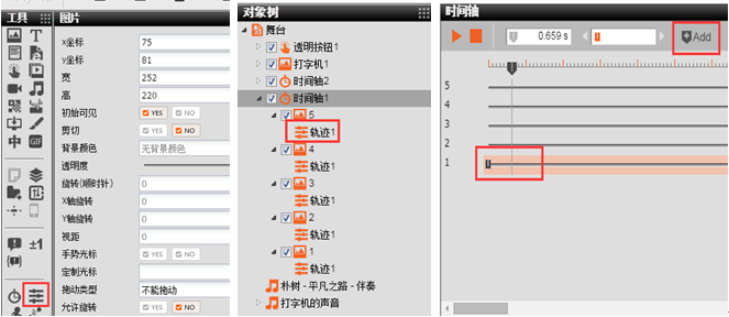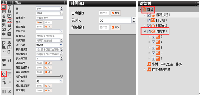 3.点击工具栏,在舞台下添加朴树的平凡之路音乐素材(音乐属性设为自动播放),添加时间轴1(根据需要,将时间轴的自动播放和循环播放属性设置为No,时间轴时长设为65s),在时间轴下添加1、2、3、4、5图片素材,让图片成为时间轴1的子对象。