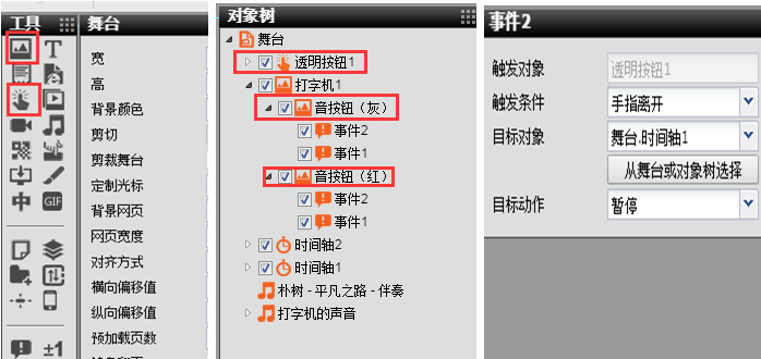 5.点击工具栏,在舞台下添加透明按钮1、添加音按钮图片素材作为按钮,在这些按钮下添加事件(以事件2为例),设置事件的触发条件,即用户做了什么动作(手指离开);目标对象是什么,即用户的动作可以控制的东西(舞台.时间轴1);目标动作,即用户的动作控制的对象做出了什么反应(暂停)。然后根据我们的逻辑顺序,用这些按钮通过事件来控制音乐和时间轴的先后播放顺序,这样就可以将具有逼真打字效果的“一步一步看清韩寒”H5作品做出来了。