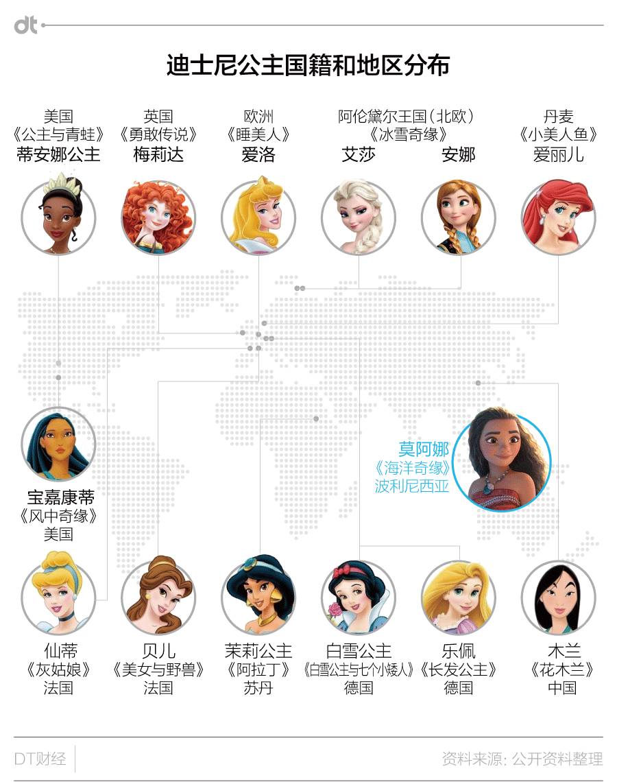 《海洋奇缘》中的莫阿娜是迪士尼动画电影中的第一位波利尼西亚公主。但她并不是第一位非白人公主。《阿拉丁》中的阿拉伯公主茉莉,《风中奇缘》中的印第安公主宝嘉康蒂,《花木兰》中的中国公主木兰,以及《公主与青蛙》中的非洲裔公主蒂安娜,她们虽然没有其他迪士尼公主的美目雪肤,但也丝毫不逊色。