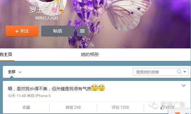 凤姐的微博有534万粉丝,因为工作关系,笔者曾在工作中咨询过一些大V广告发布价格,以此来推算,凤姐一条微博广告价格至少在五位数的价格。即便在几年前粉丝数在200万左右时候,凤姐也根本不用去美漂,更不用去做洗脚妹!然而,你如果关注凤姐的微博,可以看到她从来没有发过任何商业广告。