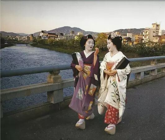 照片中身着和服的美丽艺妓穿着木屐谈笑风生,