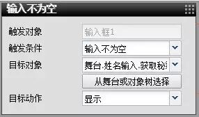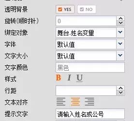 2.输入框设置时,勾选透明背景,提示文字为”请输入姓名或公号“,另外在绑定对象设置里绑定舞台上的姓名变量,目的是把输入的值传送给变量a