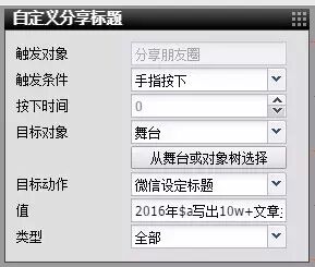 这里主要讲下如何自定义微信里的分享标题,给“分享朋友圈”按钮添加“手指按下”的触发条件。