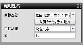 调用姓名事件:为姓名文本框设置的目标动作为”设定文字”,值为“$a”(调用变量时切记要加上美元符号)
