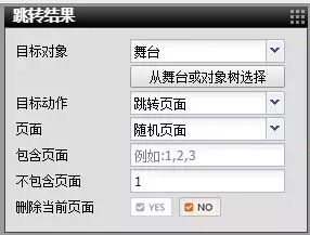 跳转结果事件:为舞台设置目标动作为”跳转页面”,页面为“随机页面”,当然还要排除姓名输入页面,也就是设置不包含页面1