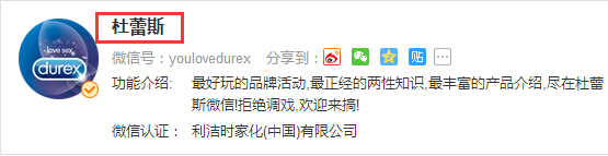 比如“杜蕾斯”,作为最为人熟知的两性行业品牌,直接使用品牌自身的名字为公众号命名,简单粗暴,让受众一目了然,马上就能联想到这就是杜蕾斯的微信账号。