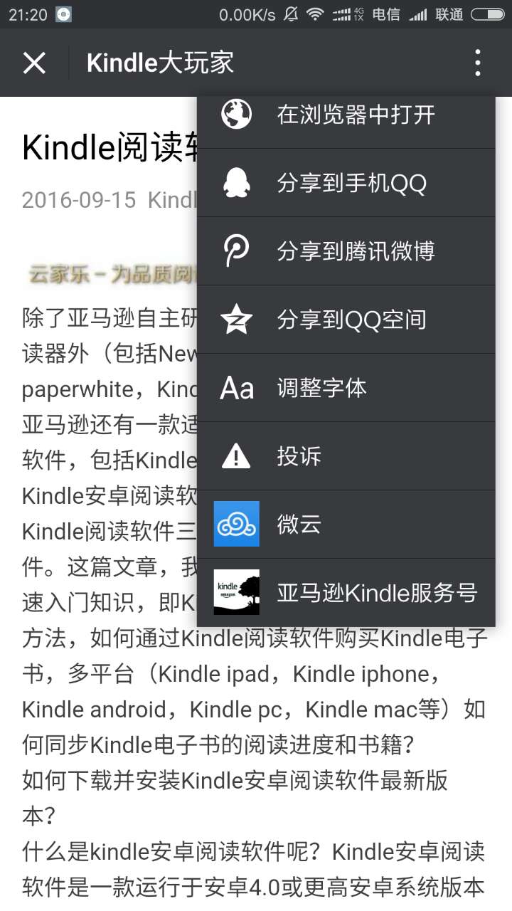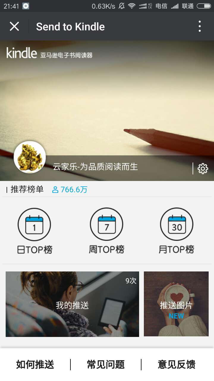1、通过send to kindle 推送微信文章:进入微信打开文字的右上角选项,选择分享到“亚马逊Kindle服务号”即可完成微信文章推送。注意:send to kindle服务会提示:文章以及国内在火速送往您的kindle中,稍等片刻哦!或在Kindle设备上点击“同步我的kindle”。