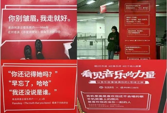 最近,网易云音乐就在杭州开展了一场地下营销活动。壕气的网易承包了整列地铁打造了一条网易云音乐的“乐评专列”。里面贴满了网易云音乐社区中,用户写下的乐评。