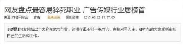 广告人,在现在看来,他们就是“熬夜加班、狂追热点”的代名词。甚至还有一种说法“广告人=慢性自杀”,这种说法似乎有点夸张,但却有其事吗? 有!并且一点都不夸张,完全有图有真相!!!每当盘点最容易猝死的职业,广告传媒必定榜上有名。