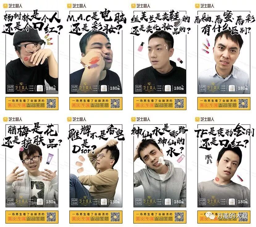 昨天,几张名为“芝士美人”的预热海报在朋友圈流传。与其他直播问答平台几乎一模一样的“****专场”+“*百万奖金”推广文案不同,“芝士美人”的问题对大叔这样的男性用户来说,都特别“刁钻”,比如“杨树林是个人还是口红?”在大叔印象里,这不是宋小宝的那个助演嘛。