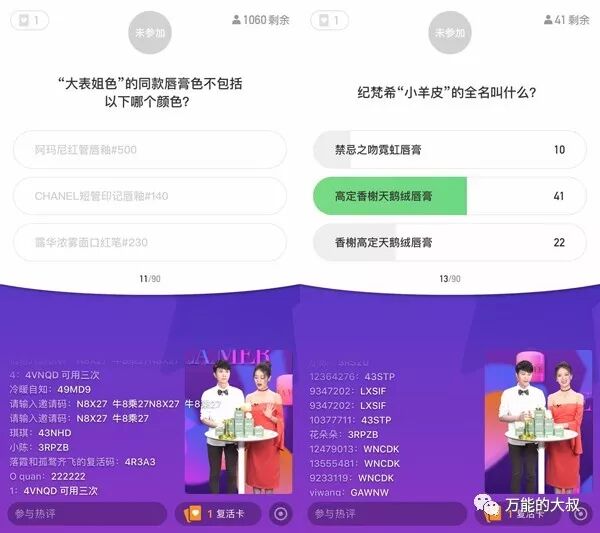 大叔在昨天中午和晚上分别“观摩”了两场“芝士美人”,不仅对所有问题一脸懵逼,对奖品更是没啥概念,但不知道为什么,女性用户参与度非常积极,可以说是热情高涨,一瓶护肤品的吸引力能超过100百万奖金?答案是肯定的。