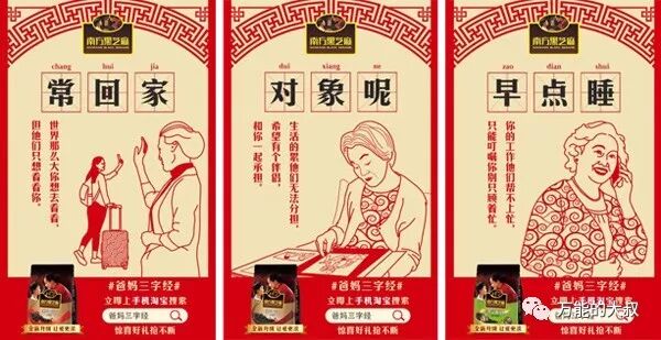 南方黑芝麻的品牌在去年进行了升级,新的品牌定位是“关爱父母,我选滋养”。中国家庭更多是父母付出型的亲子关系,比如逼婚就是很典型的案例,本应该子女自己操心的事,都交给父母,两代人的代沟越来越大。南方黑芝麻做了一个主题叫做“读懂爸妈三字经”,并联合淘宝出了一个“非和谐亲子关系”白皮书,将消费者的痛点实行高效转化。