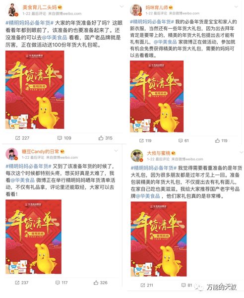 在圈层推广的手段中,华美采用了垂直媒体+社群扩散+微博蓝V+微信地方草根号相结合的方式,持续对妈妈群体进行触达。在垂直媒体上,华美选择了宝宝树,而在内容话题上,除了强调“春节送礼”外,华美还特意强调了“婆媳关系”,与聚焦妈妈群体保持高度一致。