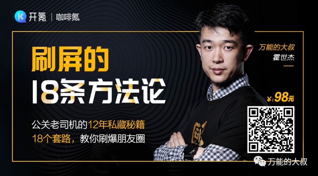 大叔在36氪的付费专栏《刷屏的18个方法论》已上线,长按扫码就能马上试读前三篇。有问题可添加大叔个人微信(wannengdedashu008)及开氪君微信(kaike36kr),还能加入讨论群。