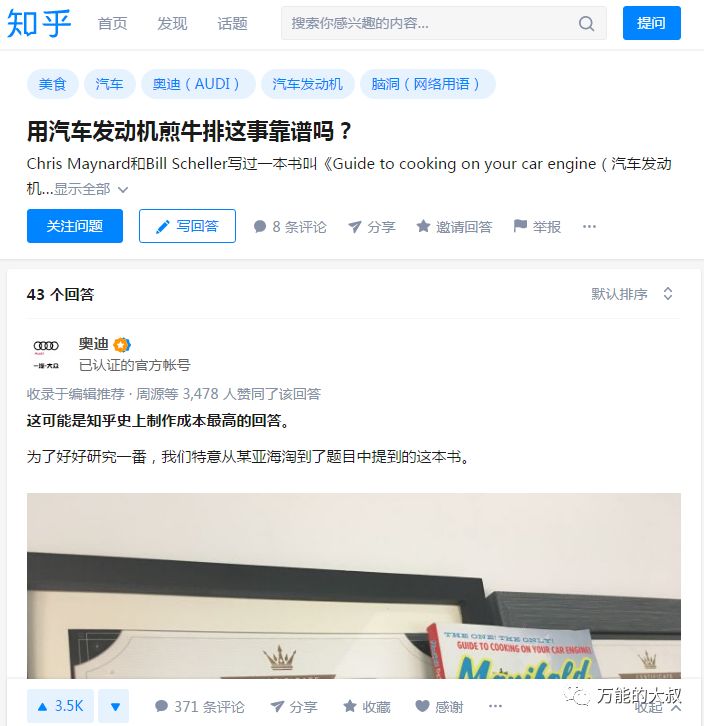 奥迪在此次知乎问答上品牌营销的精妙之处,就在于诚意十足地去实践知友关于“发动机烤牛排”的疑问,在满足知友们好奇心的同时,巧妙地以“介绍厨具的方式”来凸显产品价值卖点:如“采用 5.2FSI V10 自然吸气发动机,最大功率 610 马力。”,以及“一定要收敛你那想放纵想弹射的右脚,不然这台 3.2 秒破百的凶猛厨具会把蛋液甩的到处都是”等等。
