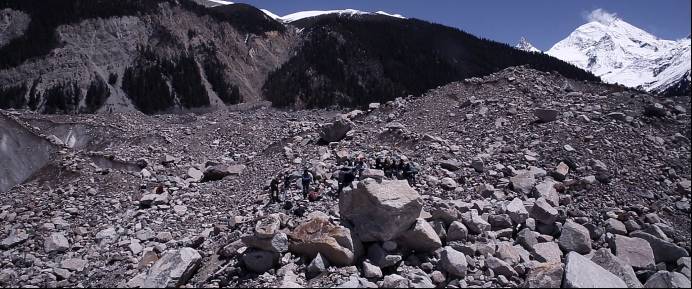 剧组在乱石覆盖的米堆冰川下拍摄“冰洞”