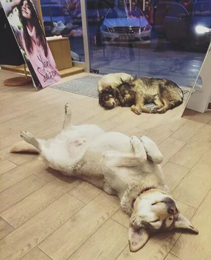 相比之下,土耳其的狗狗们就没有这样的待遇了。因为向它们开放的商场里都是些杂货商店,他们只能拿一些厚纸皮当床。