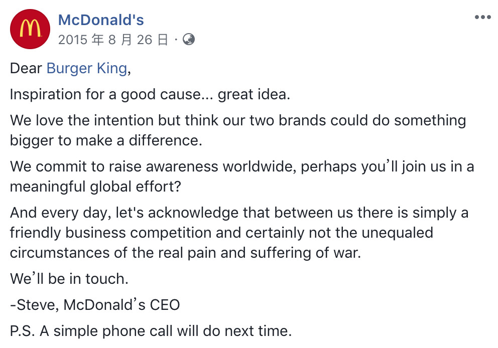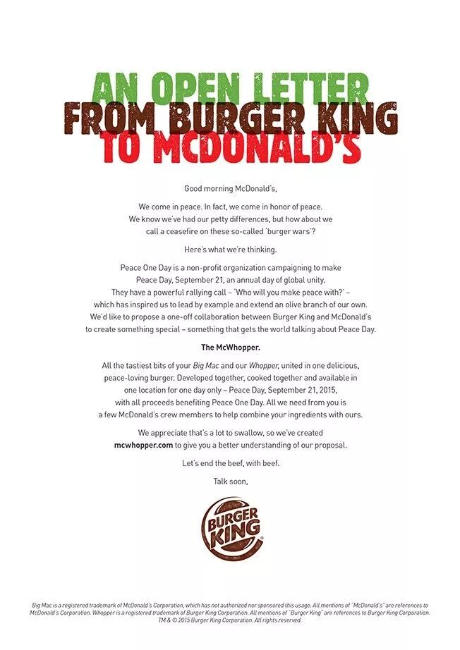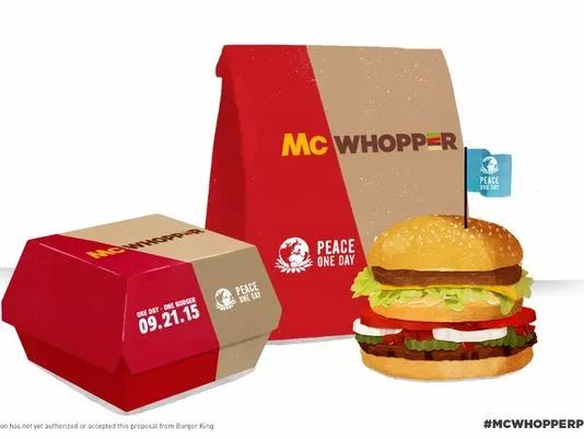 在广告牌大战之前,国际和平日,汉堡王提出了握手言和,共同推出世界和平堡,还一本正经的设计了两家合作的产品包装。