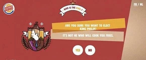 第一次你选了菲利普国王,汉堡王会说国王炸不来薯条;第二次再选,汉堡王会反问原因,并把yes选项缩小;第三次嘛......汉堡王说:「求求你们选我,1欧元,皇堡就是你的。」