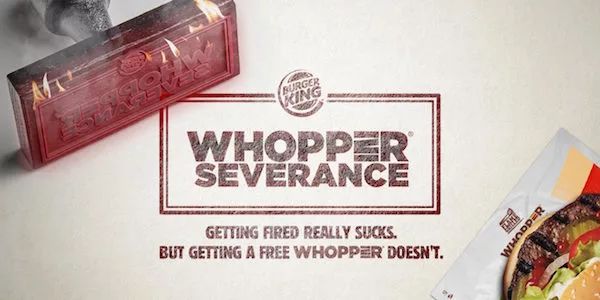 2017年8月,美国汉堡王用火玩了个谐音梗——英语里“炒鱿鱼”(get fired)和“明火烧烤”(fire grilled)差不多。如果不幸失业,可以在领英上发布“I got fired. I want a free whopper. #WhopperSeverance(我被解雇了,给我一个免费皇堡)”就能收到一封来自汉堡王的慰问邮件,附上一张抵用券,可以申请免费皇堡套餐。更贴心的是汉堡王还联合求职社区The Muse为100名职场的失意者提供30分钟一对一的专家咨询。