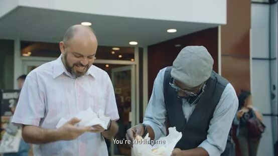而汉堡王的反击就是,在原来麦当劳的广告里加入了一对夫妇,这对夫妇走了很长的路但只在麦当劳点了一个大杯的咖啡,最后还是驱车来到到汉堡王,一边吃着美味的汉堡王,一边满足的说到:「也不是很远嘛~」(视频放在公众号本篇文章内,公众号:雅各布的作业簿)