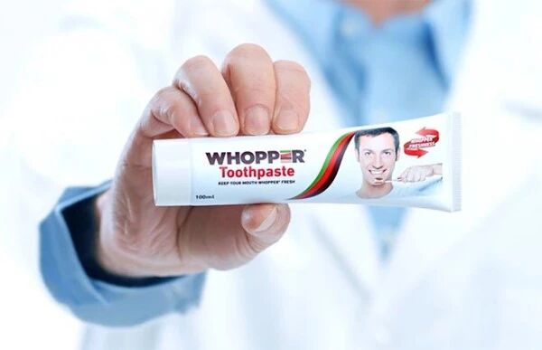 汉堡王17年4月1日推出的皇堡味的牙膏。(为什么汉堡王老是在愚人节搞事情也是有原因的,皇堡英文Whopper也有弥天大谎之意,哈哈哈,这个产品起这个名字的时候真是很有深意啊 )