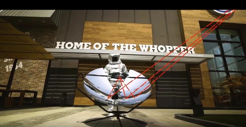 在国土面积大半被沙漠覆盖的科威特,大夏天温度时不时就会超过50度,那就来尝试一下用太阳能电池板烧烤牛肉饼吧~汉堡王代理公司 Memac Ogilvy 特别制作了一个太阳能集热装置,在上面架了一个烧烤炉。宣布只要温度达到了 122 华氏度(相当于 50°C)就为消费者提供用日照烤出的皇堡(Sun Flame-Grilled Whopper)。