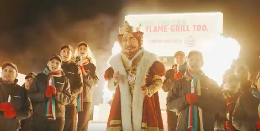 欧洲区的英国人民也没闲着,17年圣诞节用直升机运了一个超大的火焰礼物盒到麦当劳门店,然后汉堡王的带盐人「汉堡国王」按下按钮,礼物盒伴着火焰打开,汉堡王和一行汉堡王员工唱起了汉堡王的圣诞歌(求麦当劳的心理阴影面积)。
