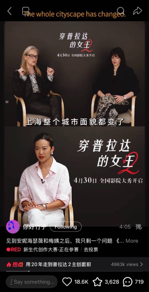 《时尚女魔头2》的国内宣发,看到了一种新方式:直接找大博主采主创,发在她们的账号上。分给每个人的时间不长,但发短视频已经很够了。 这是媒体价值被进一步替代的表现,毕竟她们粉丝多、有影响力、更“活人”,采访能力也不见得比机构媒体工作者差,甚至可能更好。 原本还想,梅姨和海瑟薇要不停见不同的人,尽量饱满地受访,真是累啊。但转念一想,她们做电影宣发一直都是这样的,只是现在见的“媒体人”不同而已。