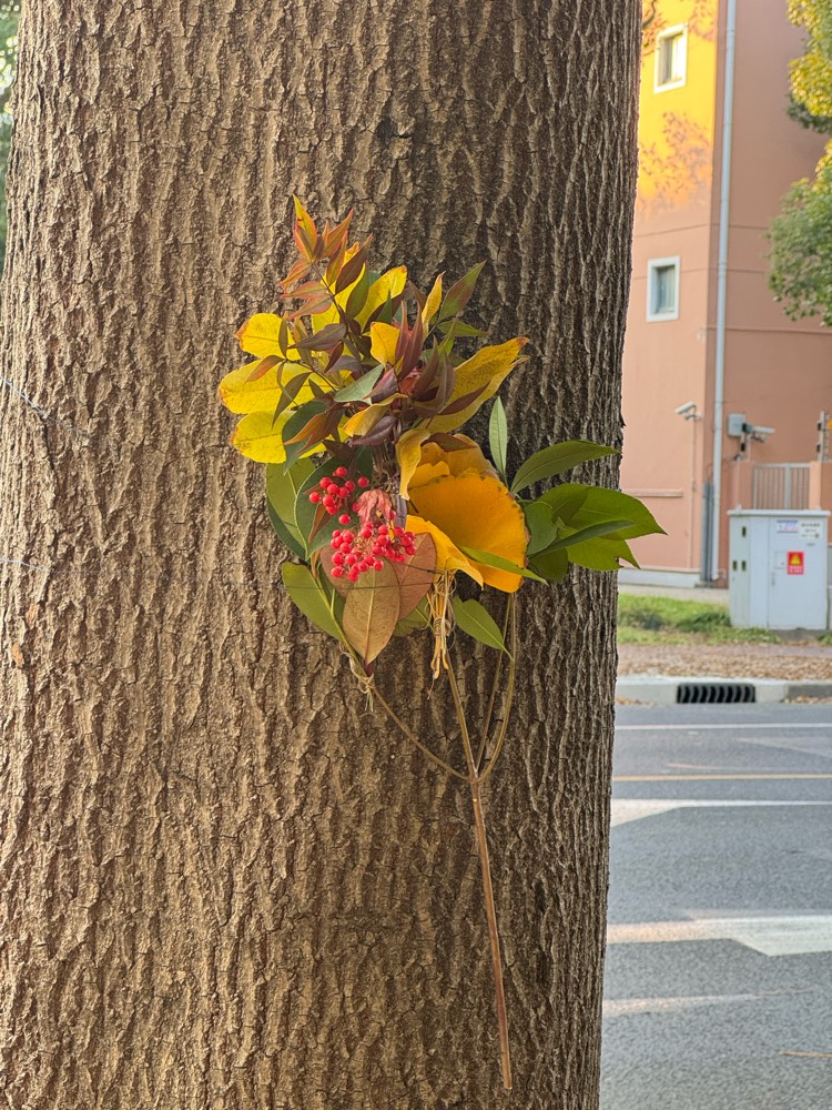 骑车路过看到的,树叶做的手捧花,那条街落叶也没扫。小红书还刷到了落叶做的灯球,何尝不是一种线下打卡经济?